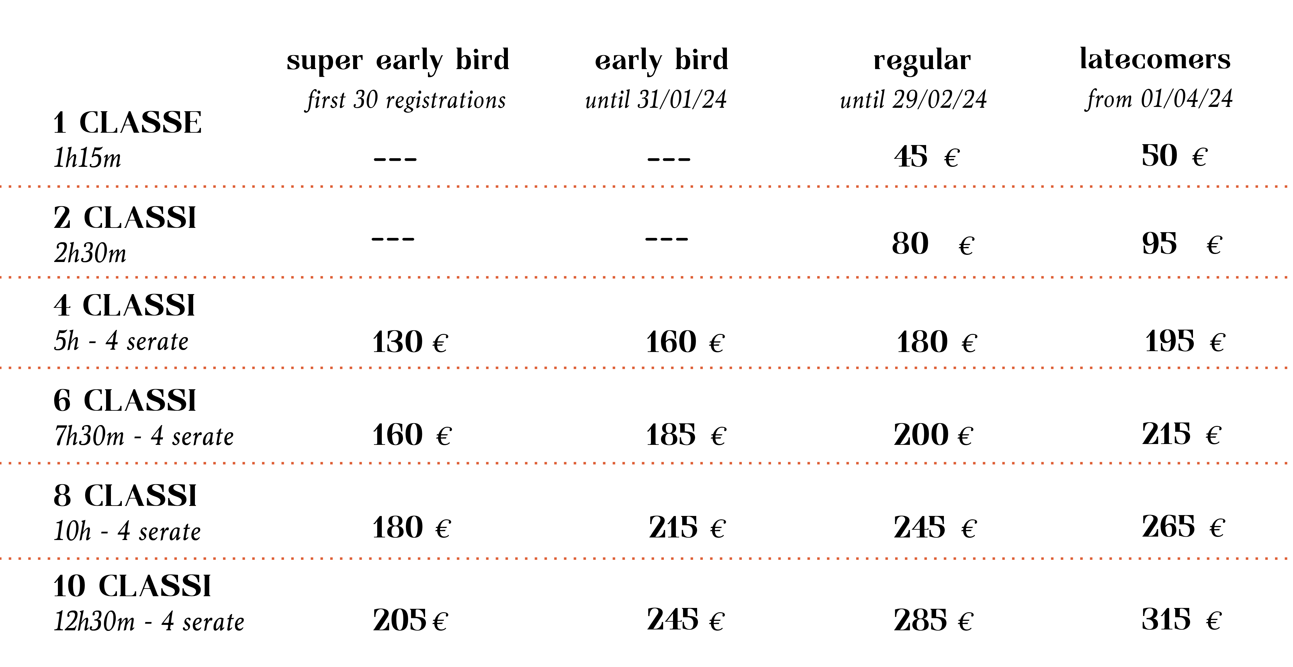 - CHOOSE HOW MANY HOURS OF CLASSES YOU WANT TO FOLLOW: 1 CLASS (1.25 h), 2 CLASSES (2,5h), 4 CLASSES (5h), 6 CLASSES (7,5 hours), 8 CLASSES (10h) or 10 CLASSES (12,5h).
